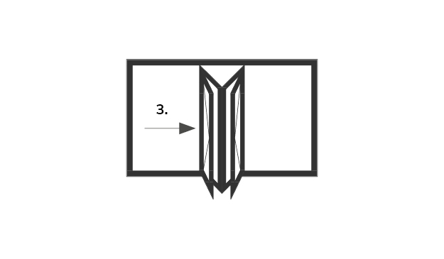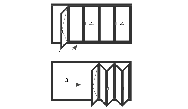 - De vouwwand wordt ontgrendeld door de greep 180° te draaien en de loopdeur zover te openen, dat deze in de vergrendeling van de naastgelegen deur vastklikt. Wanneer de naastgelegen set deuren ook voorzien is van een vergrendelingsgreep, dan moet deze voor het vastklikken worden geopend.